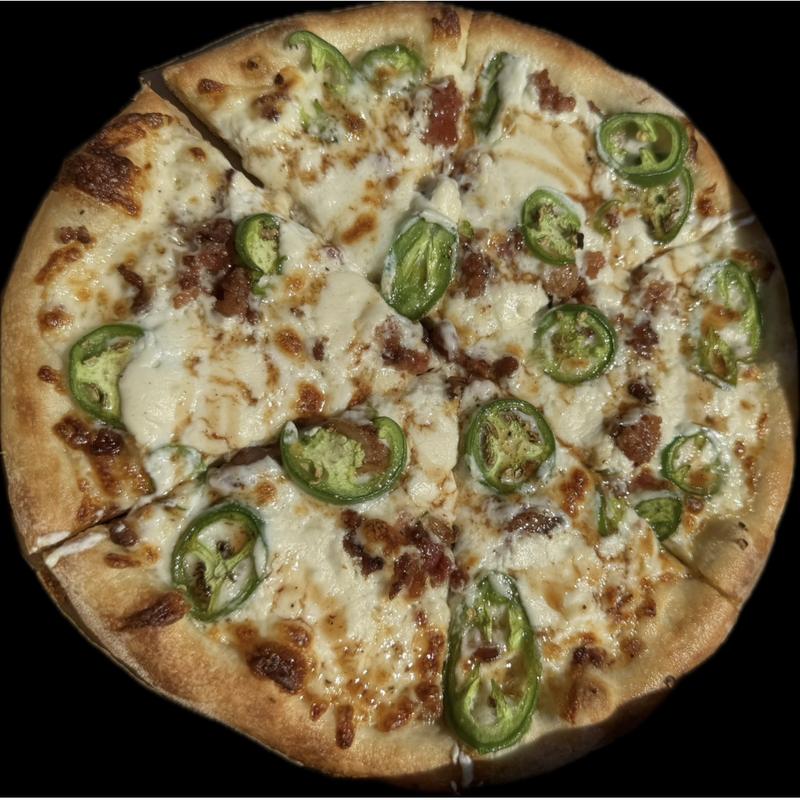 Jalapeño popper inspired pizza with bacon, jalapeno and ricotta cheese