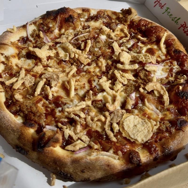 Barbecue sauce, Mozzarella, Ground Beef ,Bacon , onion topped with crispy onion